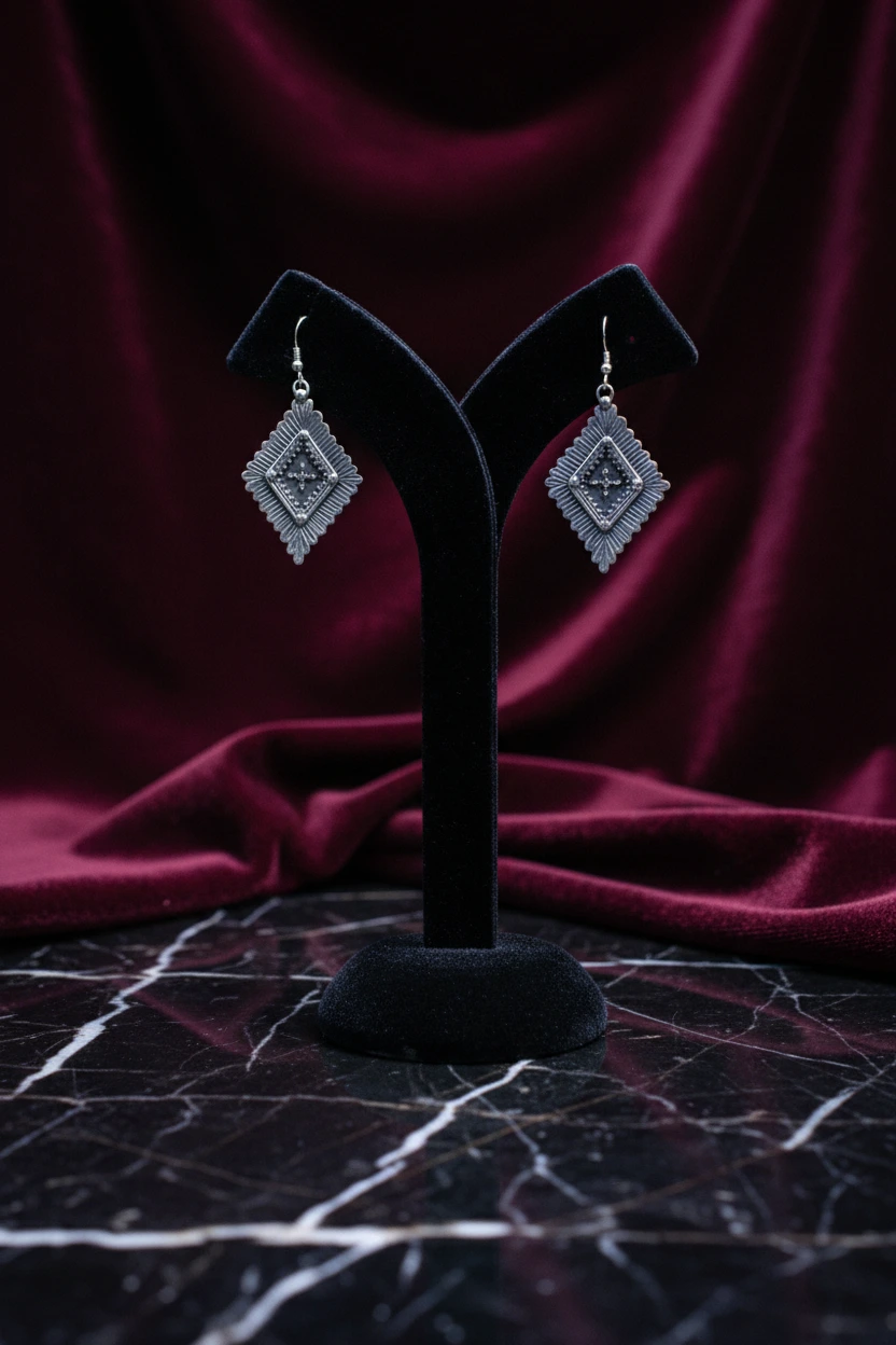 These beautifully crafted 925 silver drop earrings feature a bold geometric diamond-shaped design highlighted with intricate engraved detailing. The antique silver finish enhances the depth and texture, giving the earrings a timeless, heritage-inspired appeal.