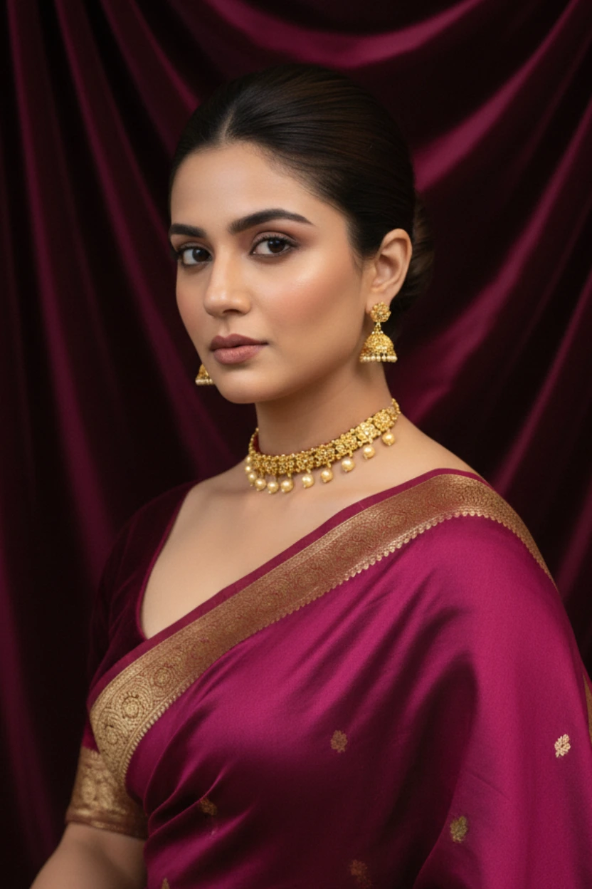 Paired with matching pearl jhumka earrings, this set is ideal for weddings, festive functions, and ethnic celebrations. The structured choker design enhances the neckline beautifully, making it a statement jewellery set for bridal and traditional outfits.