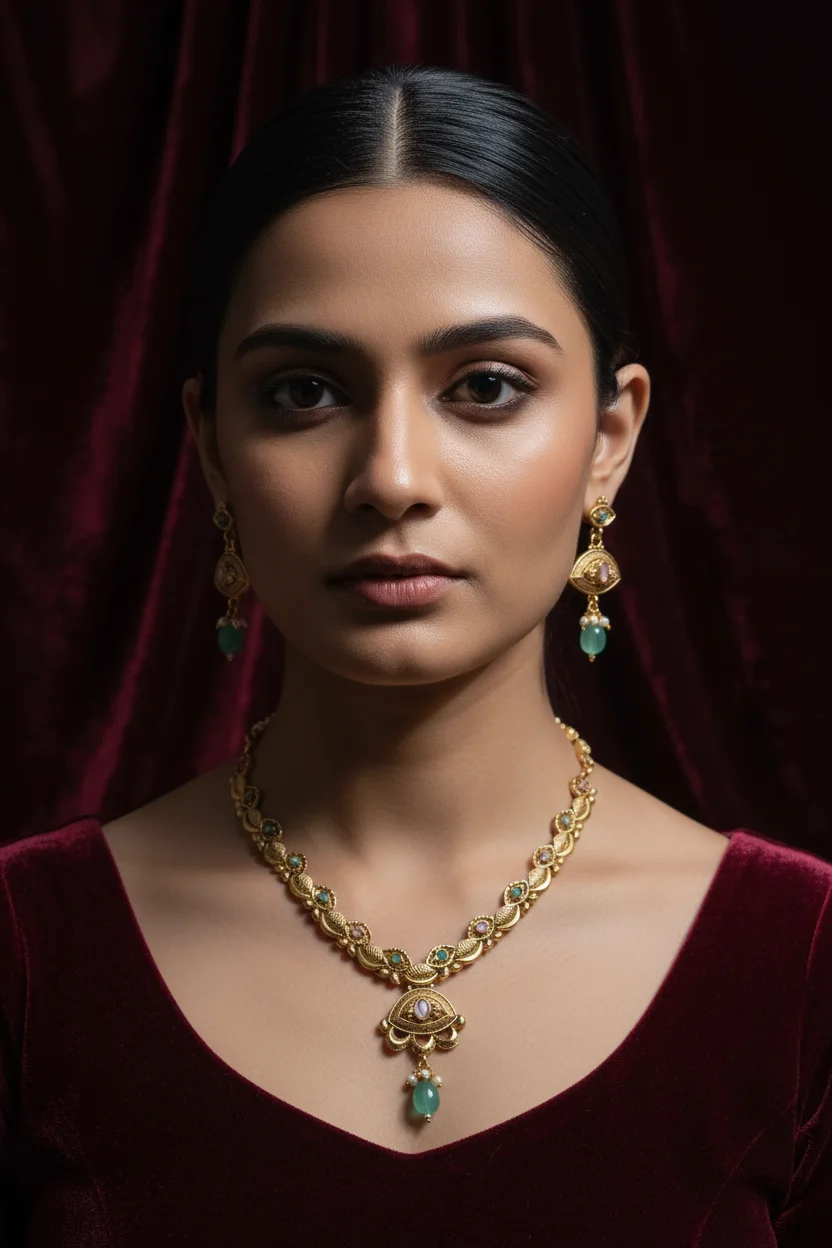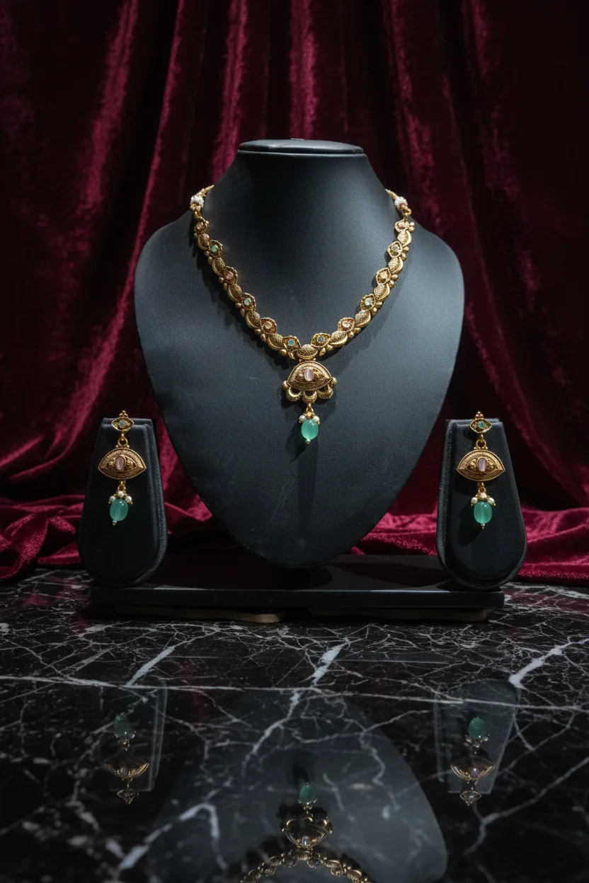 The set comes complete with matching earrings that mirror the pendant design, making it a perfect coordinated jewellery set. Ideal for festive occasions, weddings, and traditional celebrations, this necklace set pairs effortlessly with sarees, lehengas, and ethnic outfits.