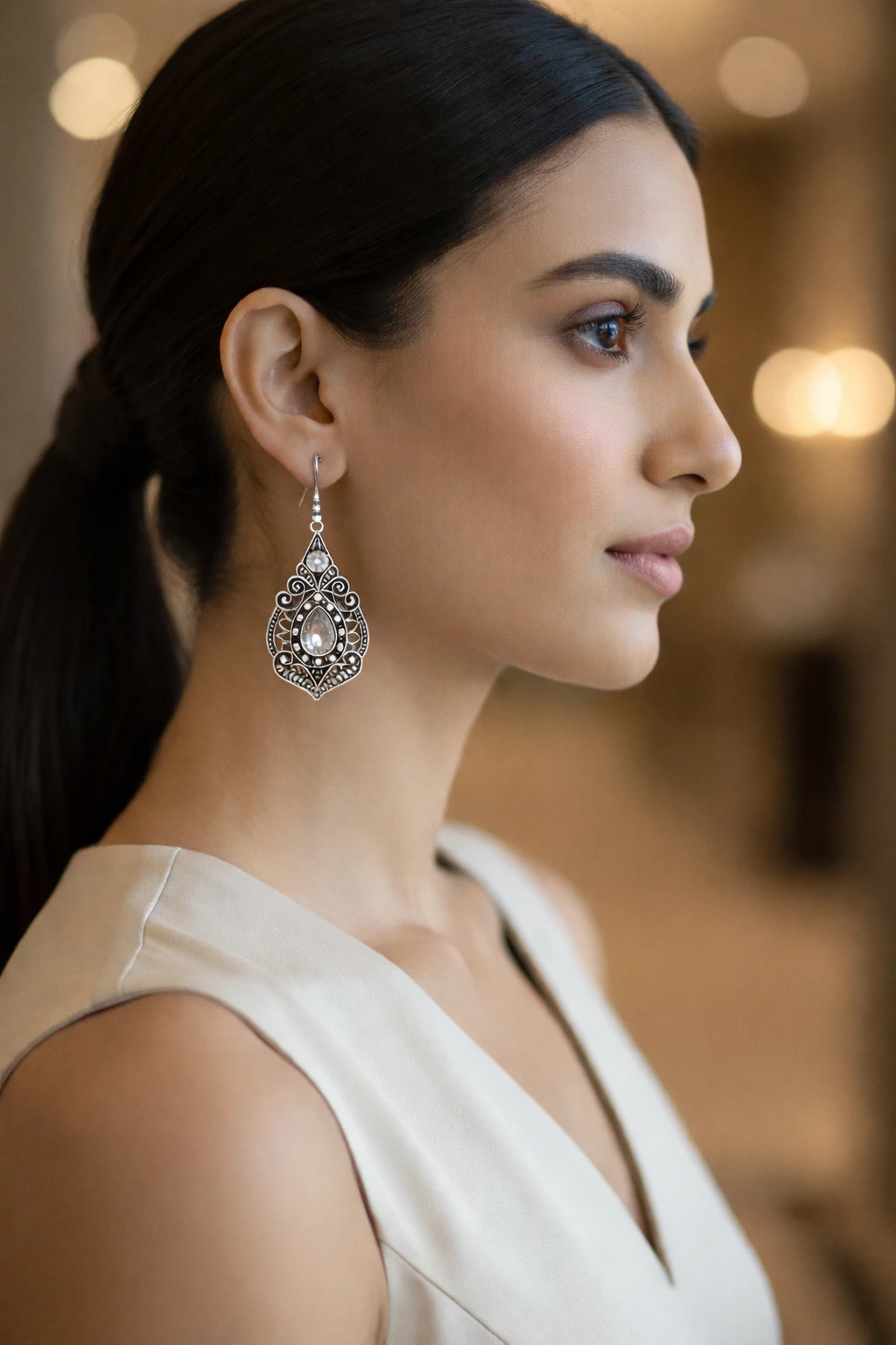 These oxidised silver teardrop stone dangler earrings showcase intricate antique-style craftsmanship combined with timeless elegance. Designed with a central teardrop-shaped reflective stone, the earrings are surrounded by delicate oxidised silver patterns that enhance their vintage appeal.