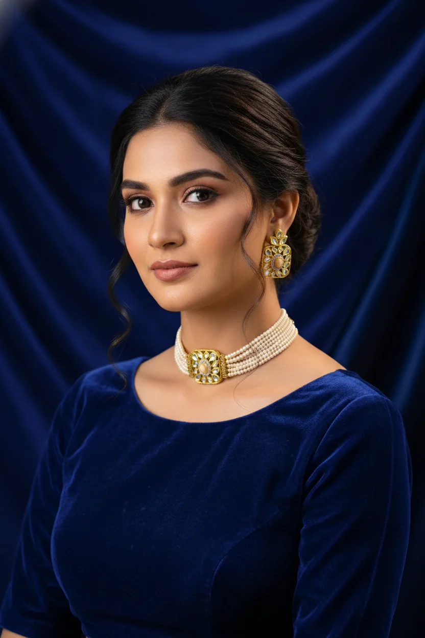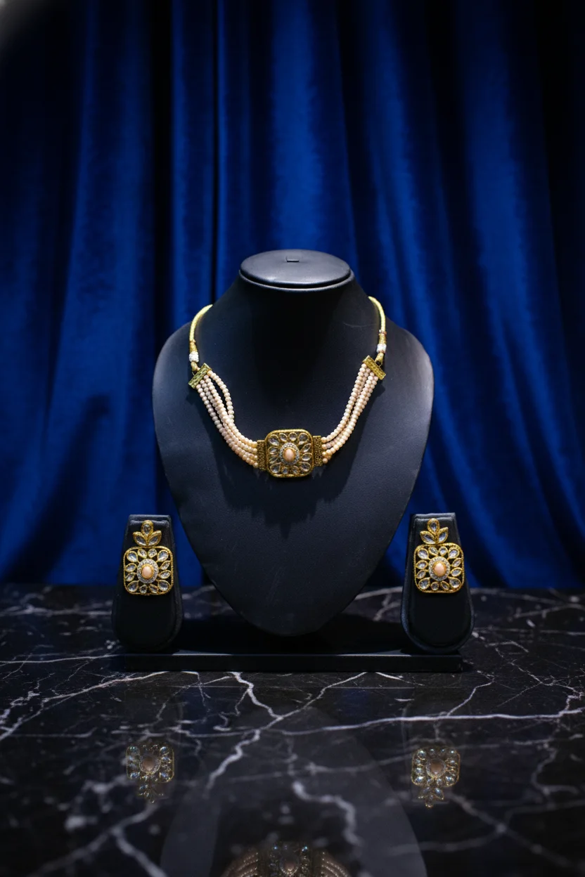 The set is completed with matching statement earrings and a coordinated maang tikka, both designed with floral kundan motifs and pearl detailing. Perfect for weddings, festive occasions, and ethnic celebrations, this set pairs effortlessly with lehengas, sarees, and bridal outfits, offering a refined and timeless look.
